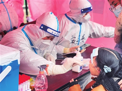 2月28日,市二院核酸采样应急队的队员们正在尖草坪区汇丰街道西流社区给市民进行核酸检测。该应急队由55名护士组成,3天共采样67561人次,用实际行动支援尖草坪区抗疫。张昊宇 薄凤萍 摄