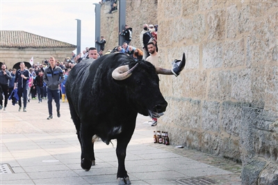 2月26日,人们在西班牙萨拉曼卡省罗德里戈城参加当地狂欢节的奔牛活动。 新华社/欧新