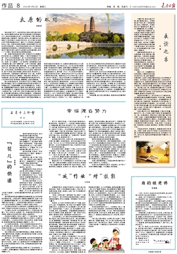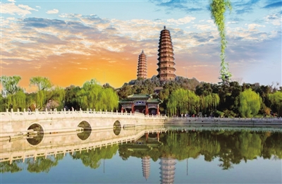 新时代以来,因为生态文明建设的提出和推动,太原的空气质量得到很大提高,加之城市规划的进一步科学合理,原本只能看见两个塔尖的双塔,如今秀美的身姿高耸于太原城东,更是成为贯穿太原东西的南沙河快速路边一道令人醉心的风景,成为太原作为中国优秀旅游城市和中部地区高质量发展中心城市的新象征。从成都回来后,开车上班的第一天清晨,拐上双塔寺街的立交桥,抬头望向东方的霎那间,我的身心为眼中所见的大美而震撼,只见满天朝霞中,双塔被阳光镶上了金边,摩天凌云,熠熠生辉,让人感受到一种磅礴的精神力量,毛泽东主席的诗句脱口而出:为有牺牲多壮志,敢叫日月换新天。