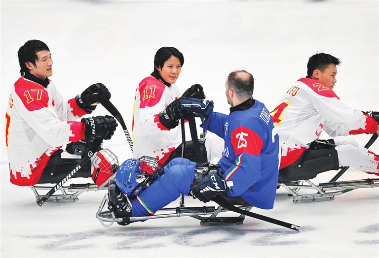 3月8日,中国队选手于静(左二)在比赛后与对手相互致意。当日,在国家体育馆举行的北京2022冬残奥会残奥冰球小组赛B组比赛中,中国队以6比0战胜意大利队,取得小组赛三连胜,以B组第一身份出线。新华社记者 张博文 摄