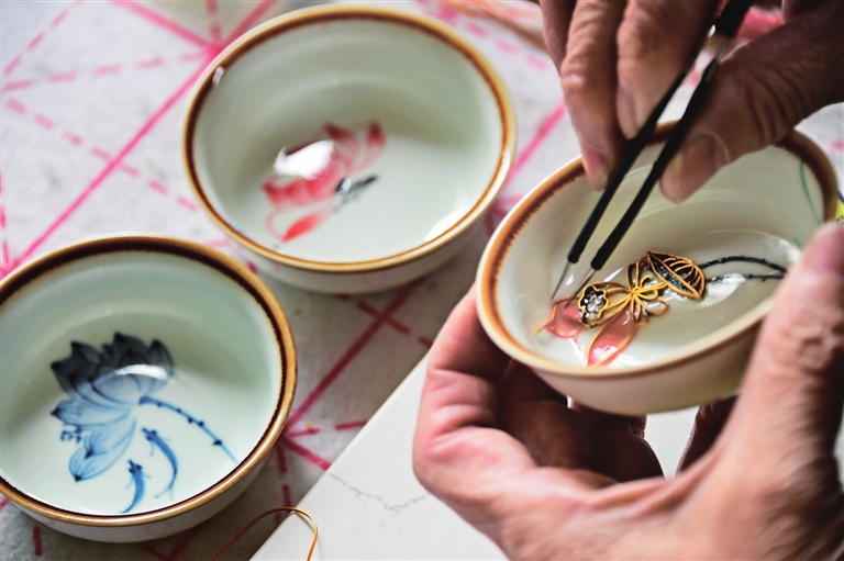工艺精湛,图案优美,散发着浓浓中国古典情调的金丝珐琅画,是一代代工匠用智慧、心血传承的文化遗产。为了让更多人热爱这门技艺,使其发扬光大,曾经一心做手艺的庄秋燕,从一个传统技艺的守护者,变为非遗文化的传播者。如今,庄秋燕所教学员近百名,年龄从6岁到80岁。