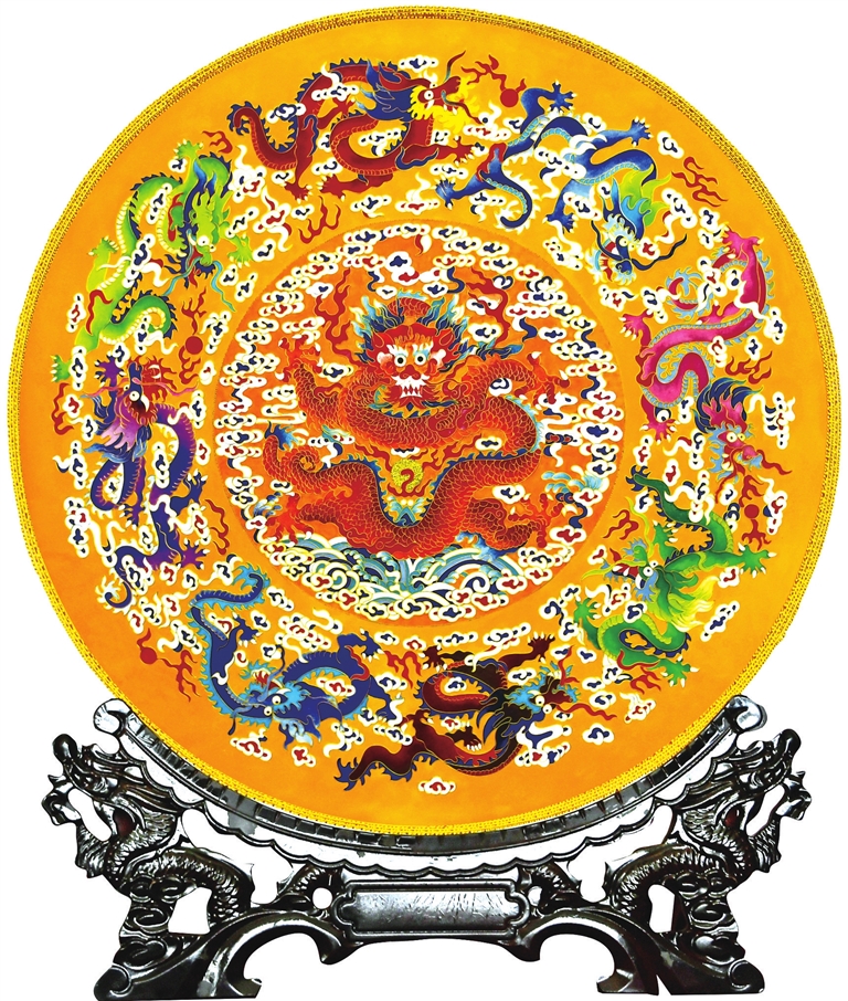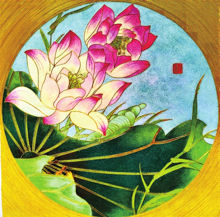 一张圆圆的木台、一块方方的亚克力板、几盏光滑的瓷盘上,荷花绽放,龙飞凤翥,孔雀展屏,牡丹吐艳,江山无限……金丝珐琅画,在这些“胎体”上,“绘”出了斑斓多彩的世界。