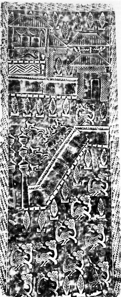 外院由高耸的阙门和折线院墙构成,给人以一波三折的动态美感。阙门有三重檐,高度超出院墙很多,显得豪气十足。院墙由门吏印模、戟印模与狗印模间隔压印而成,暗示出此院落是由规模化执戟门吏和家犬护卫着,给人以戒备森严的感觉。庭院内有斜置的骑射印模,并置或叠套共五次,表现了外院暗藏伏兵的紧张军事气氛,也点明了庭院带有武装的性质。紧挨内院外墙,有多株常青树和一只凤鸟,表现了前院内的良好生态。