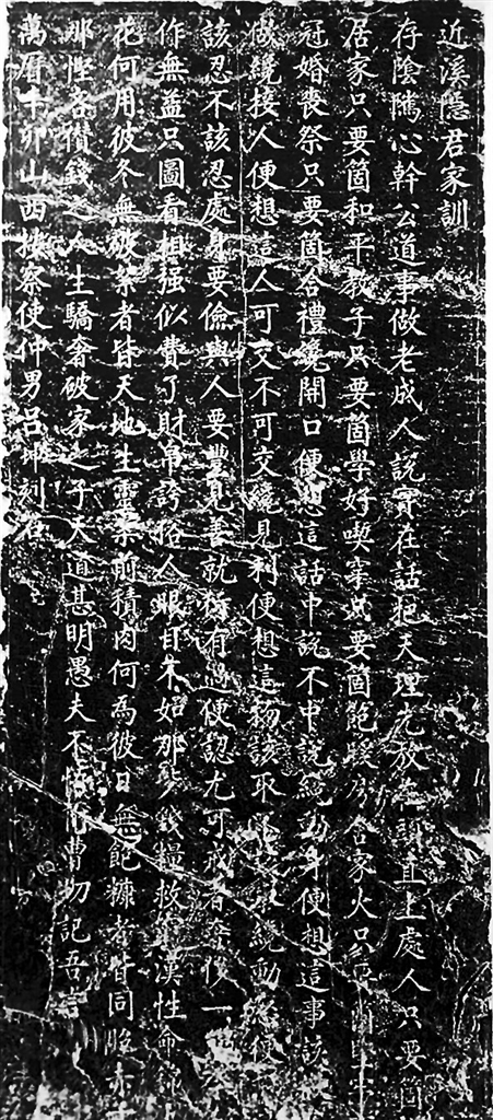 《近溪隐君家训碑》为明万历年间山西提刑按察使吕坤所刻,是一通颇有特色的石刻,迄今有400余年历史;柳体楷书,用笔苍健,结构严谨。