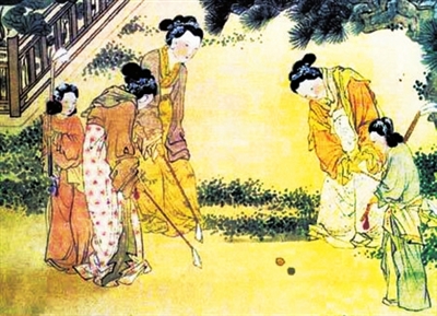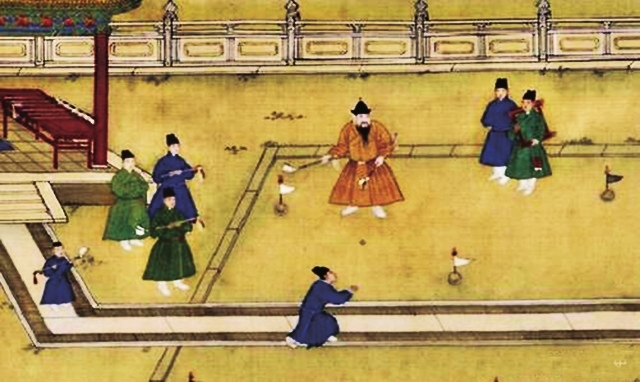 “捶丸”,顾名思义,是用小棍捶击石球。最早兴起于宋朝,从唐代的马球运动转化而来。元代,这项运动受到贵族们的欢迎,发展到了明朝,成为一项很流行的运动,上至皇帝大臣,下至三教九流,皆乐此不疲。