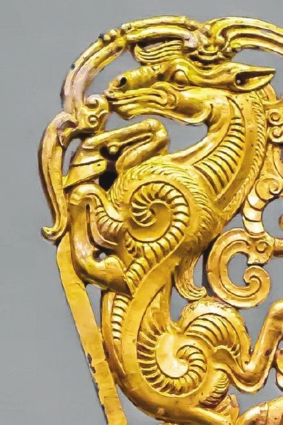 1999年,山东省济南市章丘区洛庄汉墓出土一件西汉鎏金青铜当卢,此当卢正面透雕,一带角蹄足神兽后肢朝上翻转,具有欧亚游牧民族装饰风格。