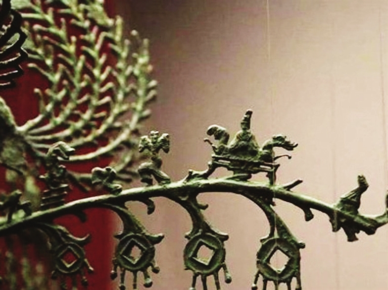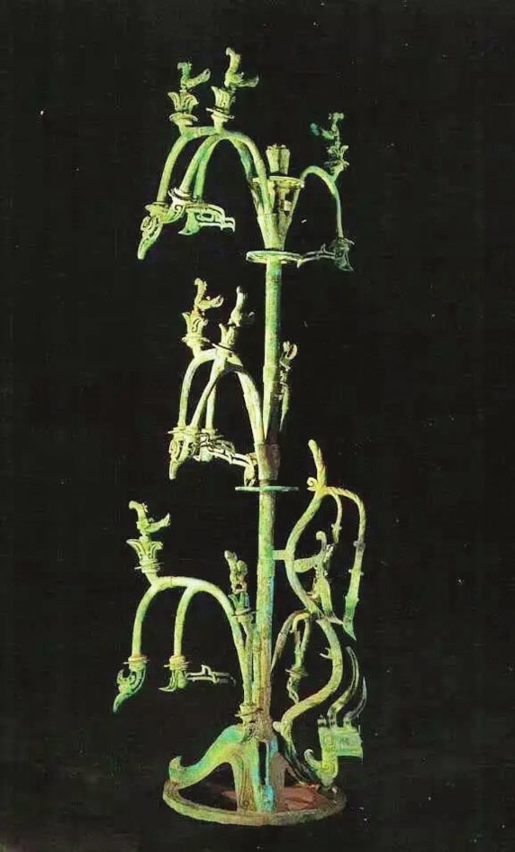 青铜摇钱树(图②)是东汉文物,1990年四川省绵阳市何家山2号汉墓出土。