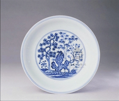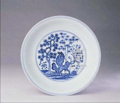 明宣德青花松竹梅纹盘(图⑥),盘心环以青花双圈,内绘松、竹、梅、山石、灵芝等纹饰。外壁绘庭园景色,远方仙山云气缥缈,近有悠闲的贵妇等人物凭栏而立,以山水、杨柳等景物相衬。宣德青花瓷器造型敦厚端庄,釉面清亮,纹饰细腻而豪放,笔法潇洒,一向被列为明代青花之冠。松、竹、梅、杨、柳等树木为瓷盘增添了无尽韵味。