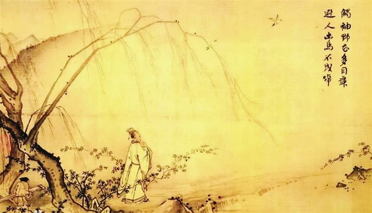柳树是春天的象征,宋代马远所作《山径春行图》(图⑤)描绘了一个怡然自得的文人,一手捋着胡须,一手挥动衣袖,漫步在春天的山径上。他面向远方,似乎在触景生情吟咏赞美春天的诗句。随风飘动的柳枝、雀跃嬉戏的小鸟、生机勃发的径旁桃花,既是在描写春天的自然景色,也是在借景抒发文人此时此刻内心充满诗意的喜悦之情。鸟语花香、春意盎然而又闲适恬静的画面气氛,是文人内在修养和心理活动的生动写照,是对春天来临唤起生命之美的赞叹。