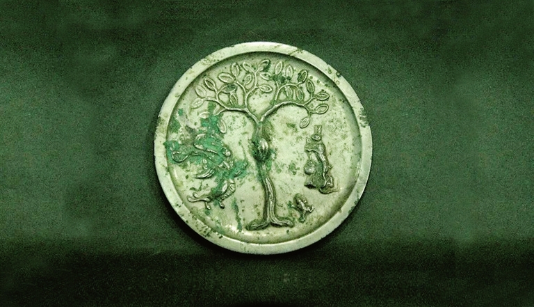 月宫镜多见于唐代,题材来源于家喻户晓的民间神话故事《嫦娥奔月》。这件唐代月宫镜(图③)镜面平整,背面内区下凹,纹饰凸雕月宫图。中央为桂树,枝繁叶茂,烘托了主题,树干中部隆起镂空为镜钮。一侧为嫦娥振袖起舞,另一侧为白兔捣药,下有蟾蜍作跳跃状,形象生动。
