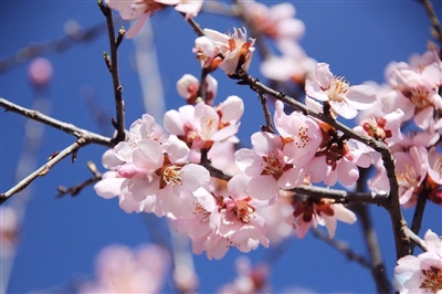 最早开的是野桃花。桃花的粉是极淡的粉,阳光下远看时,竟然觉得是雪白的,近看才会察觉到它是粉的,粉中还偏红。花骨朵红得深些,慢慢绽开的那些花就成了粉红,开得再充分些,便成了粉。五瓣,细长的花蕊,稍稍往里扣着,有些羞涩。开得最饱满的时候,一阵风吹来,就落成了桃花雪。几乎是同时,花柄和花托之间就萌出了小小的绿芽,叶子出来了。
