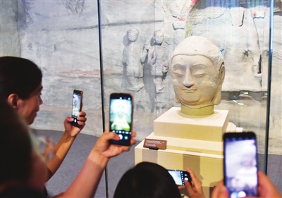 在山西省太原市天龙山石窟博物馆的一座展厅中,一尊佛首双目微闭,笑意盈盈,背后是用数字技术3D打印的模拟天龙山石窟第8窟局部。始凿于北朝东魏时期的山西太原天龙山石窟历经北齐、隋、唐等时期,留下了洞窟25个、造像500余尊。在20世纪上半叶那段风雨如晦的日子里,这里的240余尊造像被盗凿,多数成为国外博物馆和私人的收藏。