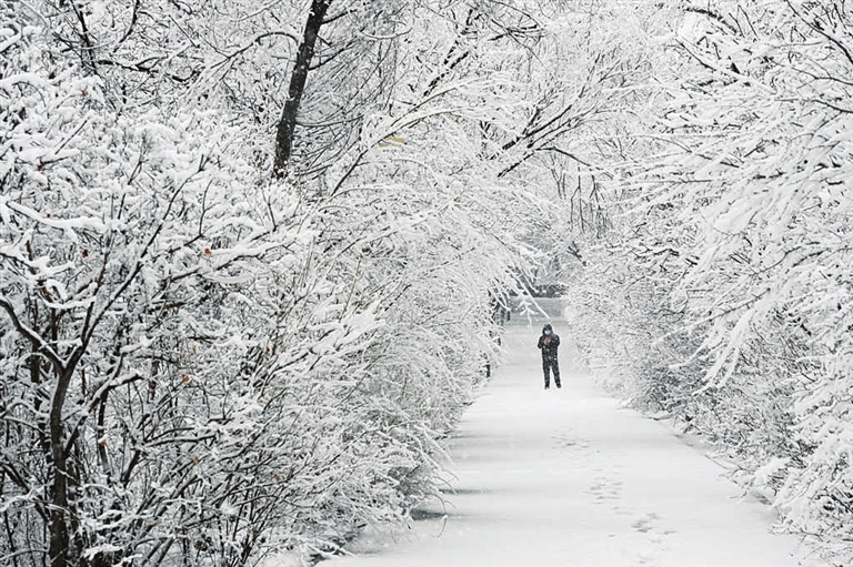 3月30日,游客在乌鲁木齐市水磨沟公园赏雪。当日,乌鲁木齐迎来降雪天气。 新华社记者 郝建伟 摄