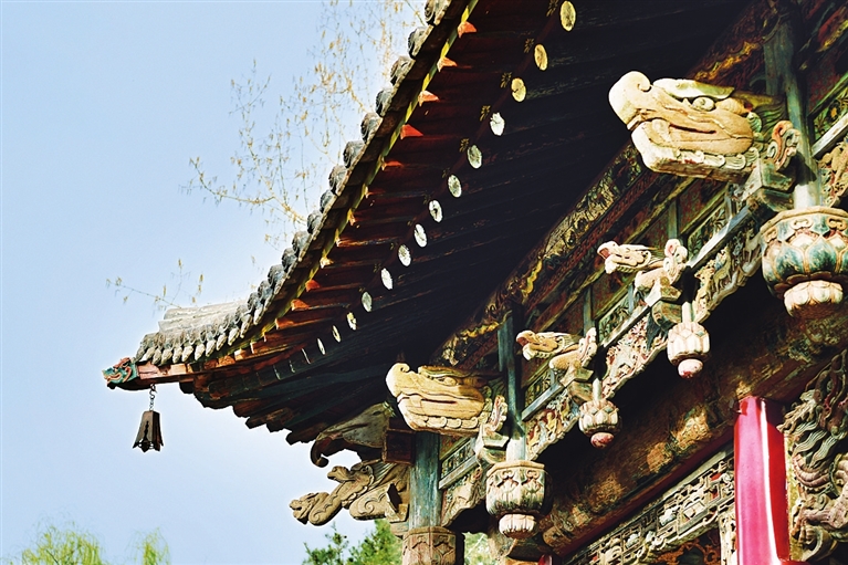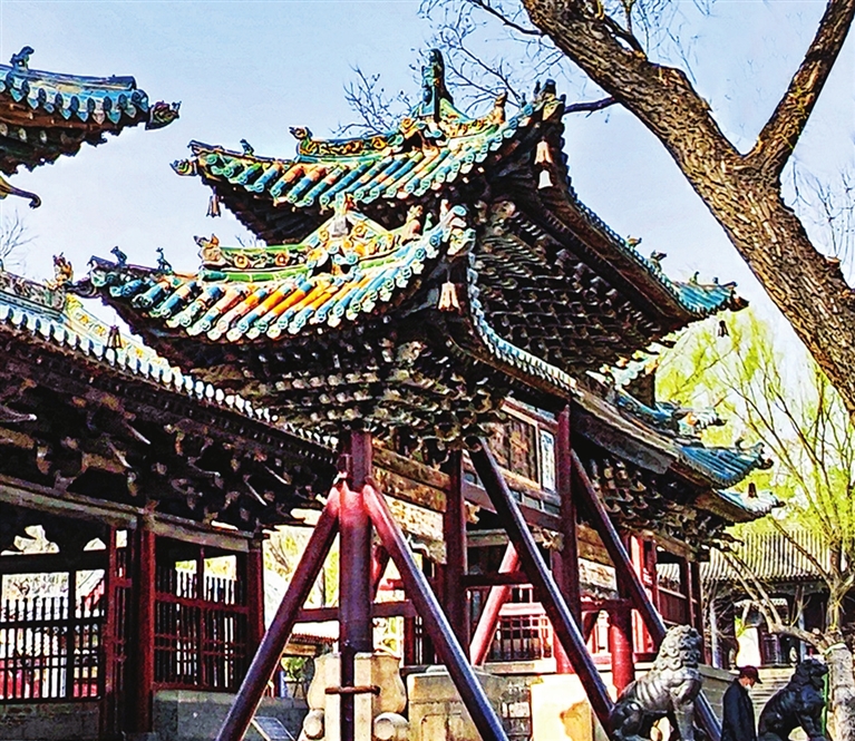 沿中轴线向西,第一座建筑是水镜台。这座始建于明代的戏台,融合了殿、台、楼、阁建筑风格。台檐上的精美木雕,翼角的铎铃,低吟着令人慨叹的过往;台柱间的“飞龙”,腾闪间,仿佛唏嘘着人间的悲欢离合;精巧的两孔花窗,好似人的双眼,静静地观望着寒来暑往……