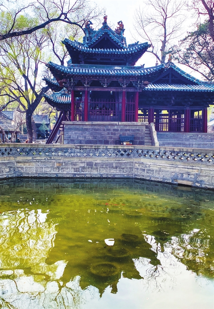 水镜台西,有一条智伯渠,会仙桥将两端通联。前方的金人台上,红、绿、黄三彩的明代琉璃阁,很是抢眼。台四周四铁人高举着臂膀,撑架着威严。