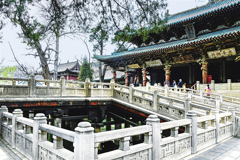 献殿与圣母殿间是一座十字形板桥——鱼沼飞梁。梁思成曾赞:“此式石筑桥,古画中偶见,实物仅此一例,洵为可贵。”