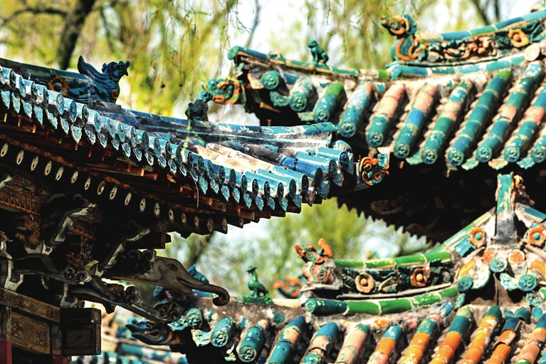 对越坊在金人台西,建于明万历四年(1576)。牌坊顶以琉璃瓦覆盖,造型玲珑剔透,疏朗大气。