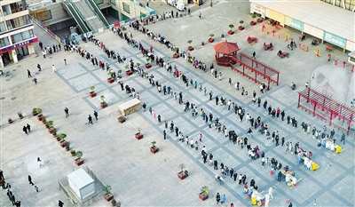 4月3日,小店区平阳景苑,社区居民积极配合防疫人员进行核酸检测,共筑严密防线。咸国庆 牛利敏 摄