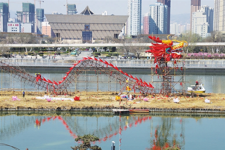 4月3日,汾河景区中华巨龙灯组景观正在更换“春装”。作为太原标志性景观之一,该灯组每年“五一”前都会进行加固翻新,重新更换灯饰及外衣。张昊宇 摄
