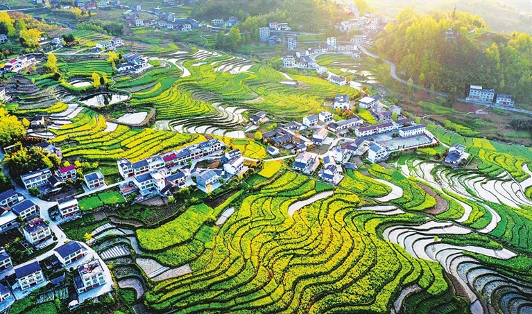 近日,秦巴山区的陕西省安康市汉阴县漩涡镇1.2万亩凤堰古梯田在油菜花的映衬下,满目锦绣。