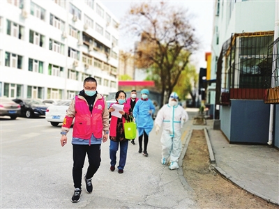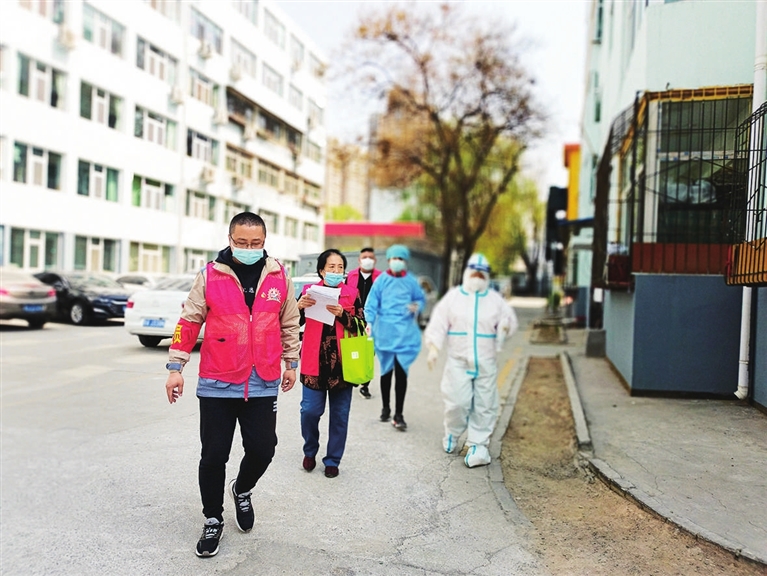 4月4日上午全员核酸检测过程中,社区发现有34户卧病在床的居民无法到场。刘峰便利用中午时间,带领医护人员、信息录入员和志愿者,上门为行动不便的特殊人群采样,跑了将近2个小时,受到居民的一致肯定和感谢。