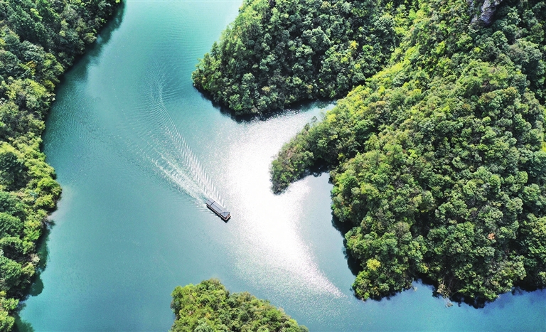 4月5日,游人乘船在湖南省张家界市武陵源区宝峰湖景区游览(无人机照片)。