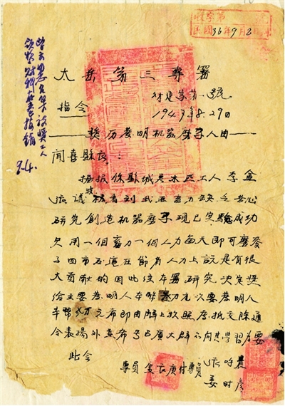 据报,你县城关木匠工人李金、张议波看到我区畜力缺乏,苦心研究创造机器磨子,现已实验成功。只用一个畜力、一个人力,每天即可磨麦子四市石,这在节省人力上说是有很大贡献的。因此,经本署研究决定,奖给主要发明人本币三万元,次要发明人本币二万元。希即由解上款照簿抵交。除通令表扬外,并希号召广大群众向其学习为要。