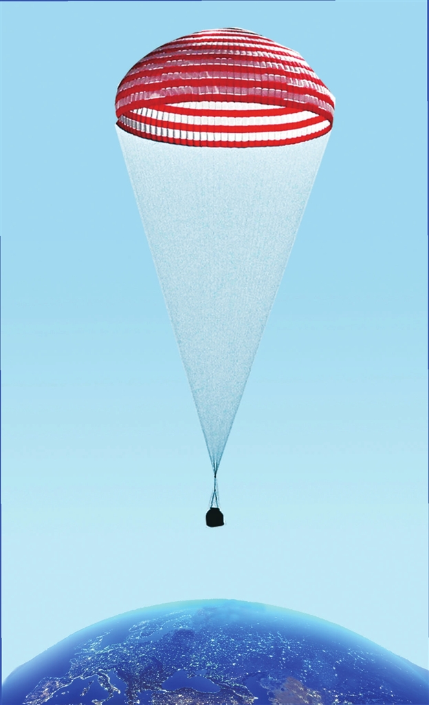 随后,北京飞行控制中心大屏幕上显示,红白相间的主降落伞迅速打开,牵引着神舟飞船在东风着陆场的上空缓缓垂落。