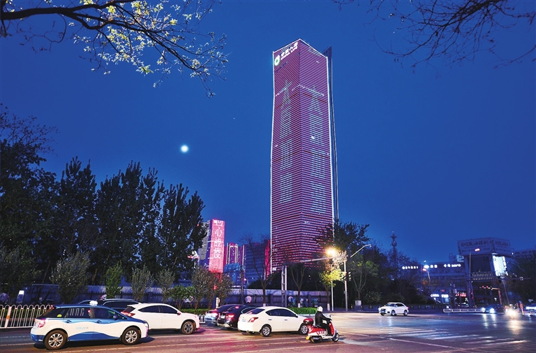 4月17日晚,迎泽桥西一栋高楼外立面上显示出“太原加油”的抗疫标语,向每一位参与抗击疫情的市民致敬。