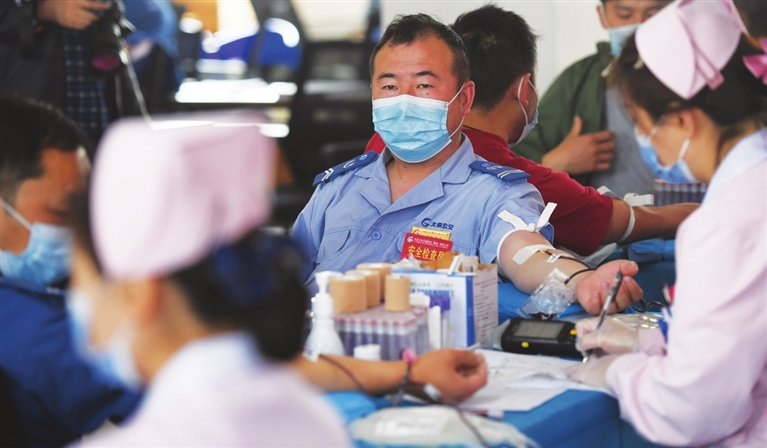 4月20日,太原市公交三公司组织69名职工无偿献血,以实际行动缓解我市用血紧张,传递温暖与爱。 邓寅明 摄