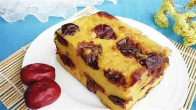 热气腾腾的枣介糕,红红的枣和金黄的面层层叠叠,黄里嵌红,红中镶黄,尤其是黄米和红枣散发着清甜香气,让人垂涎。枣介糕热吃最佳,刚一出锅就装盘上桌,因为此时最为黏软筋道。