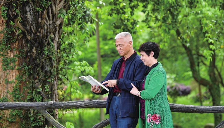 左图:在湖南省常宁市西岭镇,两位老人在阅读图书。
