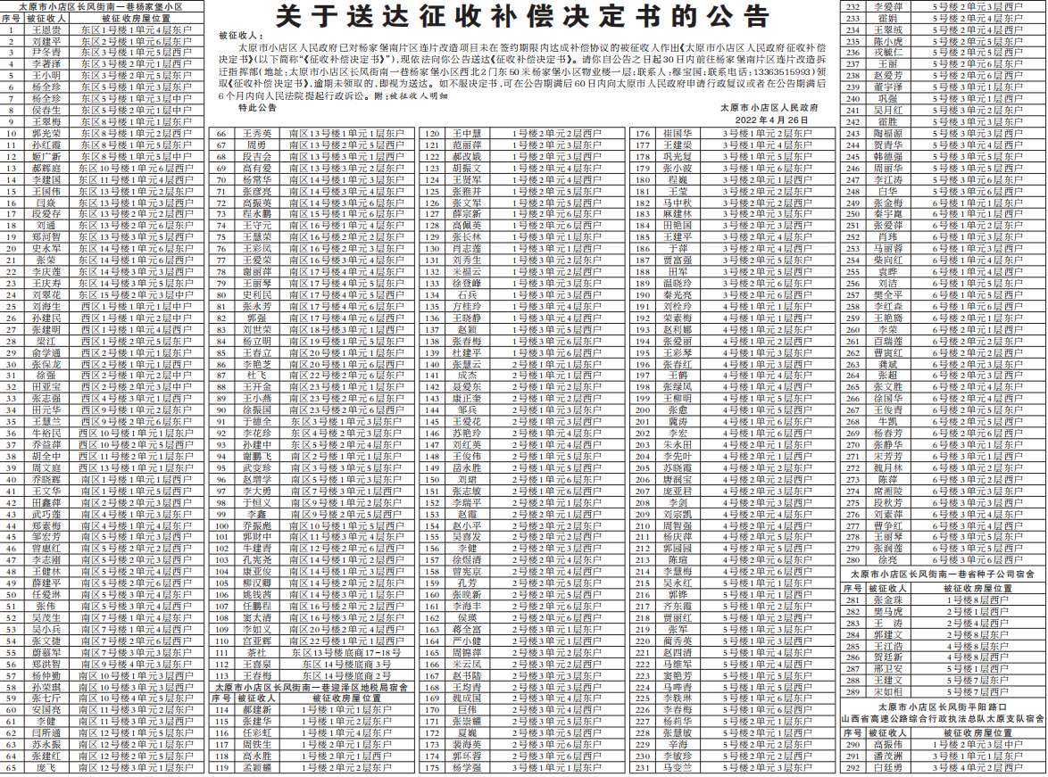 太原市小店区人民政府已对杨家堡南片区连片改造项目未在签约期限内达成补偿协议的被征收人作出《太原市小店区人民政府征收补偿决定书》(以下简称“《征收补偿决定书》”),现依法向你公告送达《征收补偿决定书》。请你自公告之日起30日内前往杨家堡南片区连片改造拆迁指挥部(地址:太原市小店区长风街南一巷杨家堡小区西北2门东50米杨家堡小区物业楼一层;联系人:穆宝国;联系电话:13363515993)领取《征收补偿决定书》,逾期未领取的,即视为送达。如不服决定书,可在公告期满后60日内向太原市人民政府申请行政复议或者在公告期满后6个月内向人民法院提起行政诉讼。附:被征收人明细