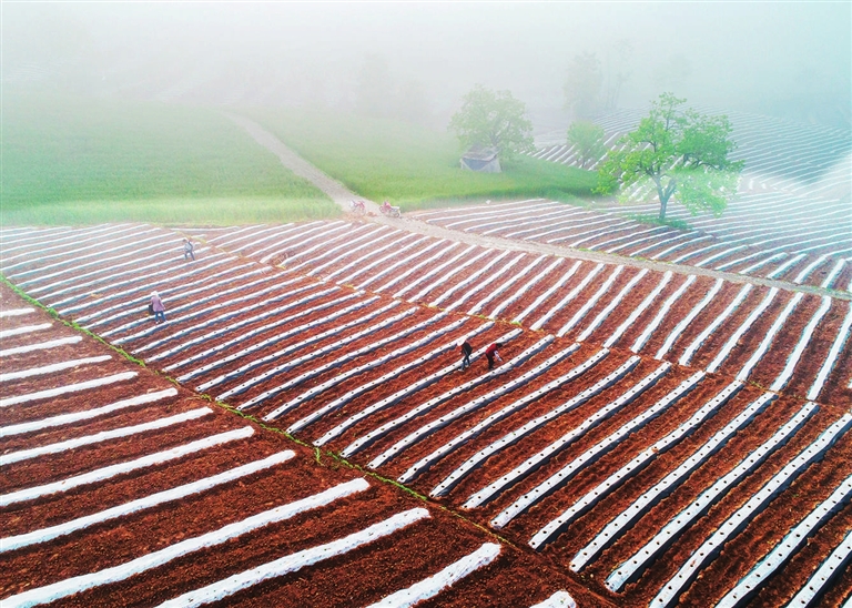 近年来,陕西省汉中市略阳县郭镇谭家庄村进行荒地综合治理、坡地改梯田等,修复耕地3000余亩。4月26日,汉中市略阳县郭镇谭家庄村农民在田间劳作。 新华社发