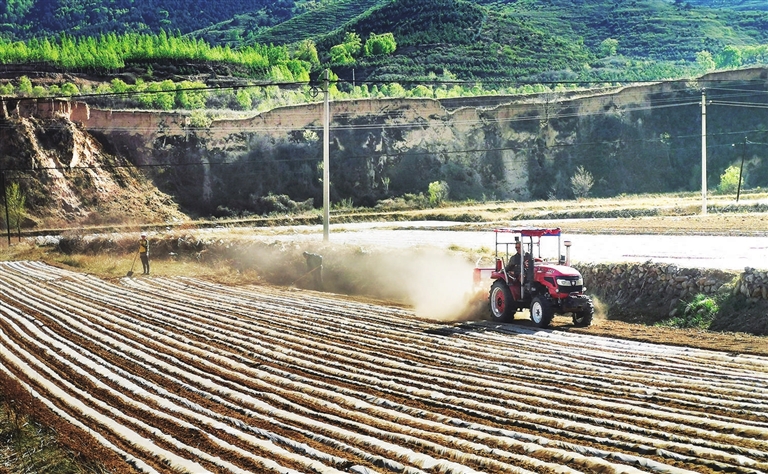 5月6日,阳曲县西凌井乡扫峪村的农民抓住墒情有利时机,开足马力进行高粱播种。 王韵菲 徐浩轩 摄