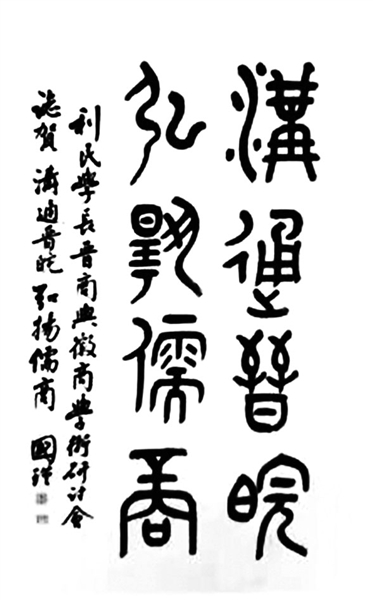 拙作在母校召开学术研讨会,我的大学同窗、中文系七八级学友王玉声、景宏业、肖亚光、周同馨、李建荣等都拨冗参加。张瑞鹏、淮万年、赵运中、孙满仓、张亚平、宋哲锋、郑钢花、李春荣、杨永生、高巨海等都以不同的方式祝贺。我的高中同学、山西大学美术学院书法系教授、山西省书法家协会主席姚国瑾不仅两次为我题写书名,且联络省城知名作家参加学术研讨,他本人也在会上作了简要发言,并于会前书写了“沟通晋皖,弘扬儒商”八个大字,祝贺拙作研讨会顺利召开。