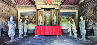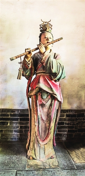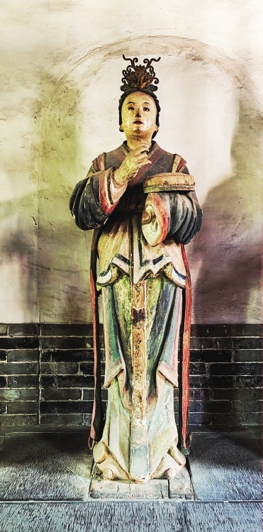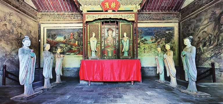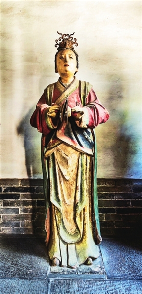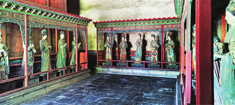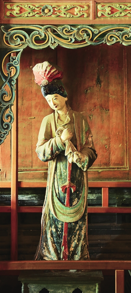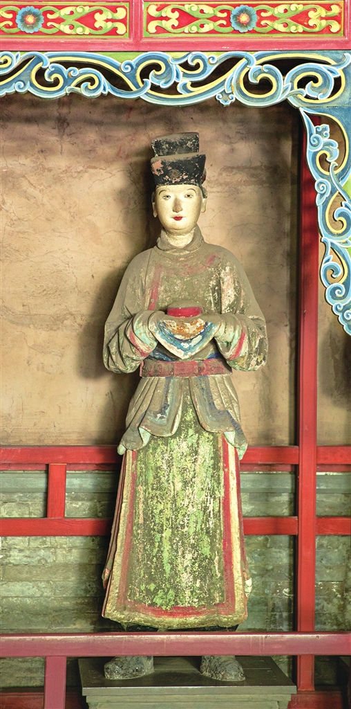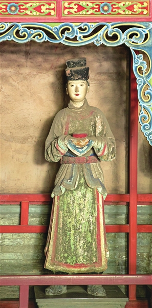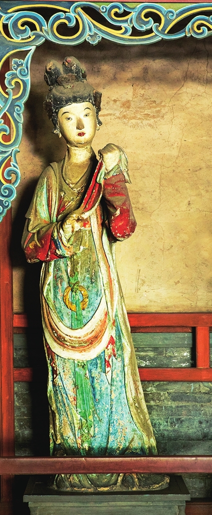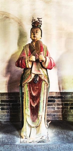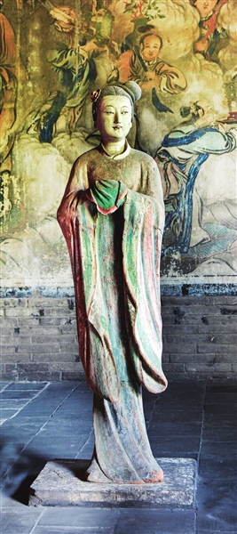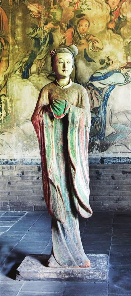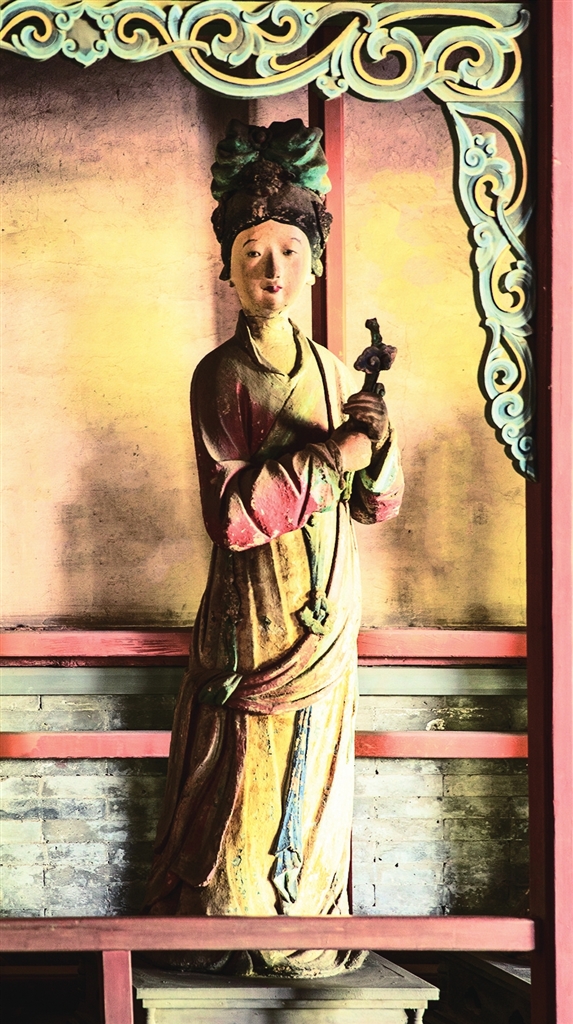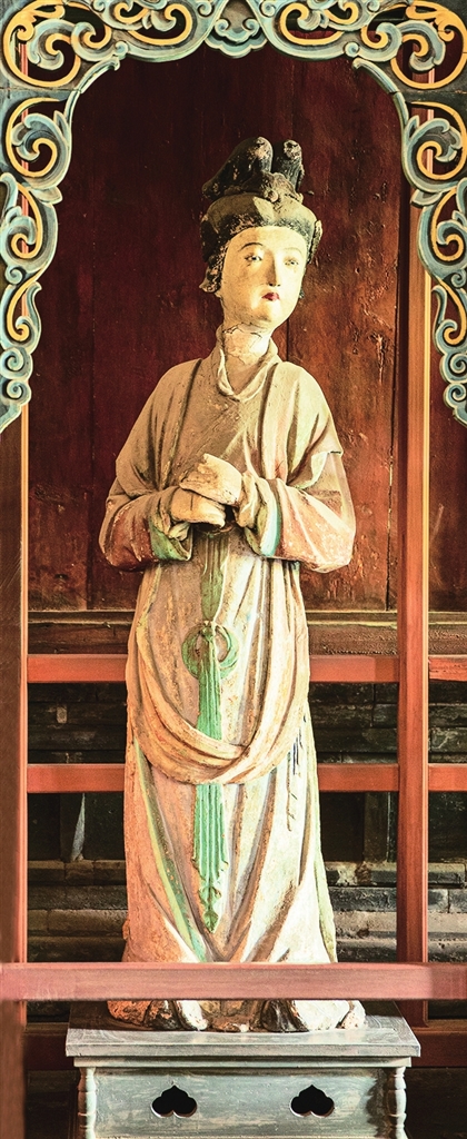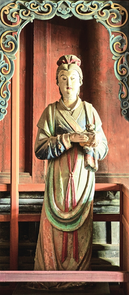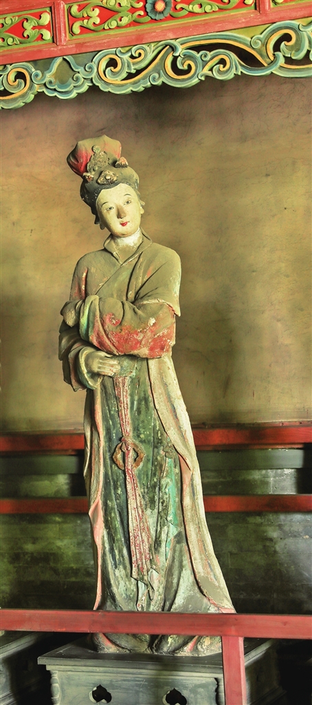 两旁6尊侍女俏然而立,身材略显扁平,展现了少女的柔美。从彩塑后面看去,她们的背影酷似水中游鱼,优美而轻盈,为明代彩塑中的精品。