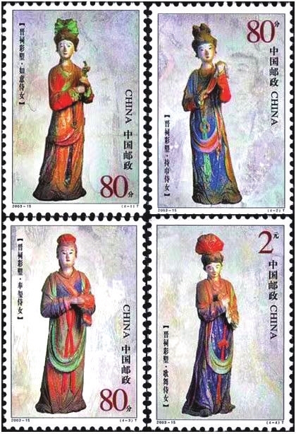 圣母殿宋代侍女像在中国美术史上具有重要地位。2003年,国家邮政局发行了一套4枚《晋祠彩塑》特种邮票。图案分别是其中的“如意侍女”“持巾侍女”“奉玺侍女”“歌舞侍女”,以此展现中华民族辉煌和灿烂的文化艺术成就。