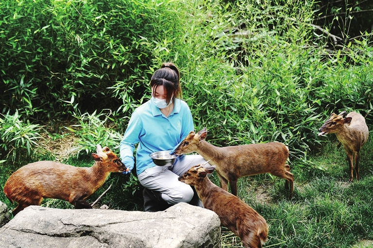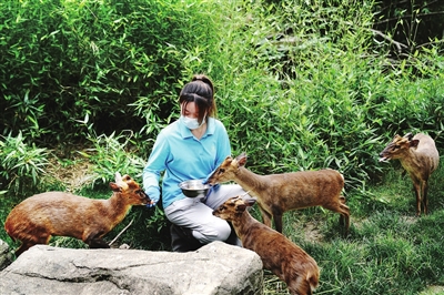 5月19日,在上海动物园乡土动物区,饲养员和一群黄麂在一起。