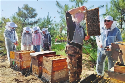 5月22日,小店区西家凹村,养蜂人在给游客展示酿蜜过程。随着东山生态修复,该村利用得天独厚的环境优势,发展蜜蜂养殖、度假经济等产业,推动乡村振兴,实现农民增收。