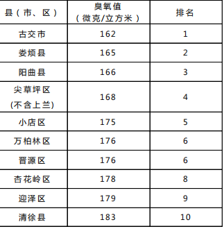 根据山西省太原生态环境监测中心数据,我市各县(市、区)2022年5月16日~5月22日臭氧污染由轻到重排名如下。