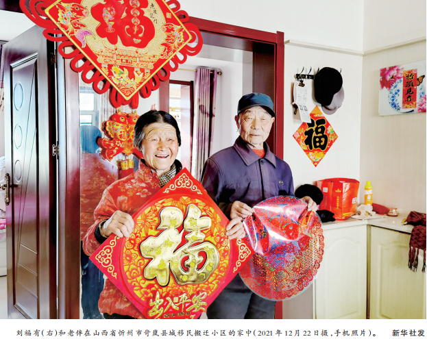 赵家洼村特困户刘福有一家,过去住在吕梁山深处的土坯房里,2017年9月搬进县城移民新区,住上楼房。“5年前总书记到大山沟里来看我们,还一起算收入账,让我们对过上好日子充满信心。”刘福有说,“我想向总书记报告,现在我们老两口干上了保洁员的工作,每年工资、土地流转费加起来有4万多元。生活条件好了,身体也好,心里美呀。”