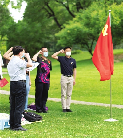 这次活动上,博士生郭军炜发展成为一名预备党员。此前,他主动报名参加了核酸检测志愿工作。“虽然几个小时下来,衣服就湿了大半,但要成为一名合格党员,就得在这种关键时候冲在前面、服务群众。”他说。