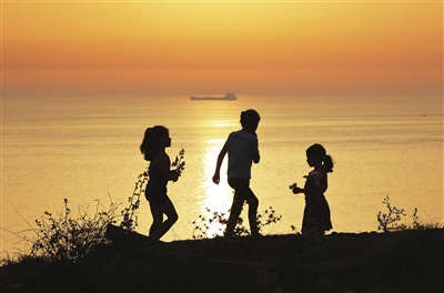 5月28日,在黎巴嫩贝鲁特的海边,孩子们在夕阳下休闲。 新华社记者 刘宗亚 摄