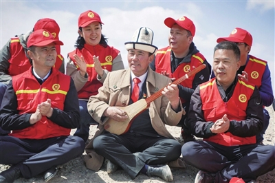 游客想给牧民一些报酬表示感谢。见到钱递到自己面前时,牧民阿布都加帕尔·猛德急忙推辞,并自豪地展示自己胸前佩戴的共产党员徽章。