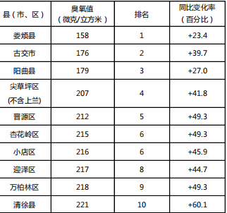 根据山西省太原生态环境监测中心数据,我市各县(市、区)2022年5月23日~5月29日臭氧污染由轻到重排名如下。