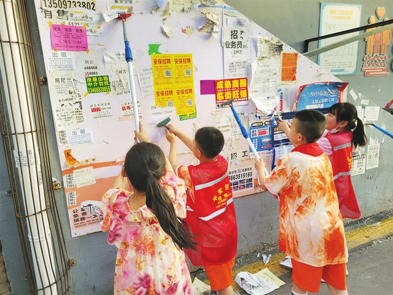 “我来铲!”走入居民区,看到墙壁上胡乱张贴的小广告,墨墨和小伙伴们拿着铲子上前,争先恐后地抢着铲除。有的小广告粘贴得特别牢,孩子们就先用喷壶喷喷水,再用铲子一点点地铲,还小心地捏起掉到地上的纸屑。