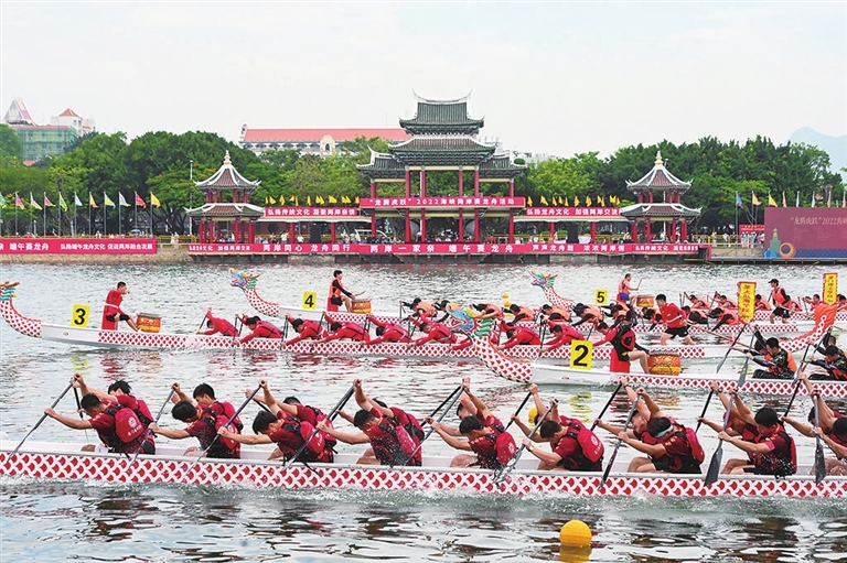6月2日,在“龙腾虎跃”2022海峡两岸赛龙舟活动现场,参加龙舟比赛的龙舟队奋勇争先。 当日,“龙腾虎跃”2022海峡两岸赛龙舟活动在福建厦门举行,两岸41支参赛队的千余名选手乘风逐浪、奋勇争先。新华社记者 周 义 摄
