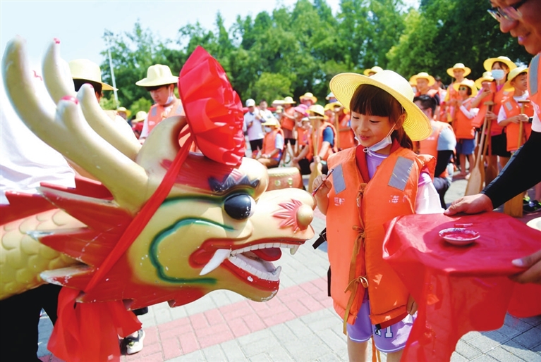 六月三日,在河南省洛阳市凌波湖,一名小朋友参加趣味龙舟赛点睛仪式。