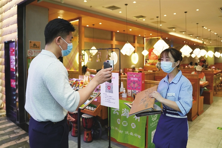 11时许,五棵松华熙live的各家餐厅陆续有客人进店就餐。“我们响应号召,要求隔位就座,提倡使用移动支付等无接触结算方式。”季卫东说。